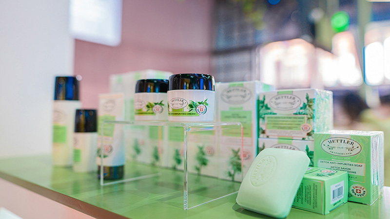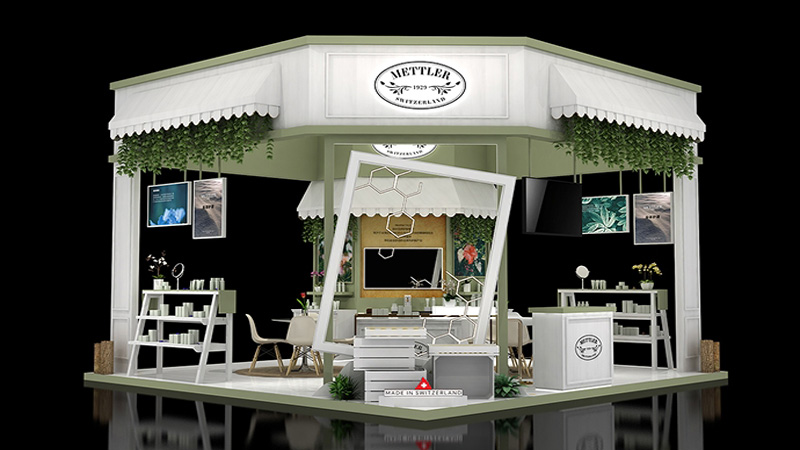 Mettler是瑞士護(hù)膚品牌,展臺設(shè)計(jì)感覺很天然很舒適