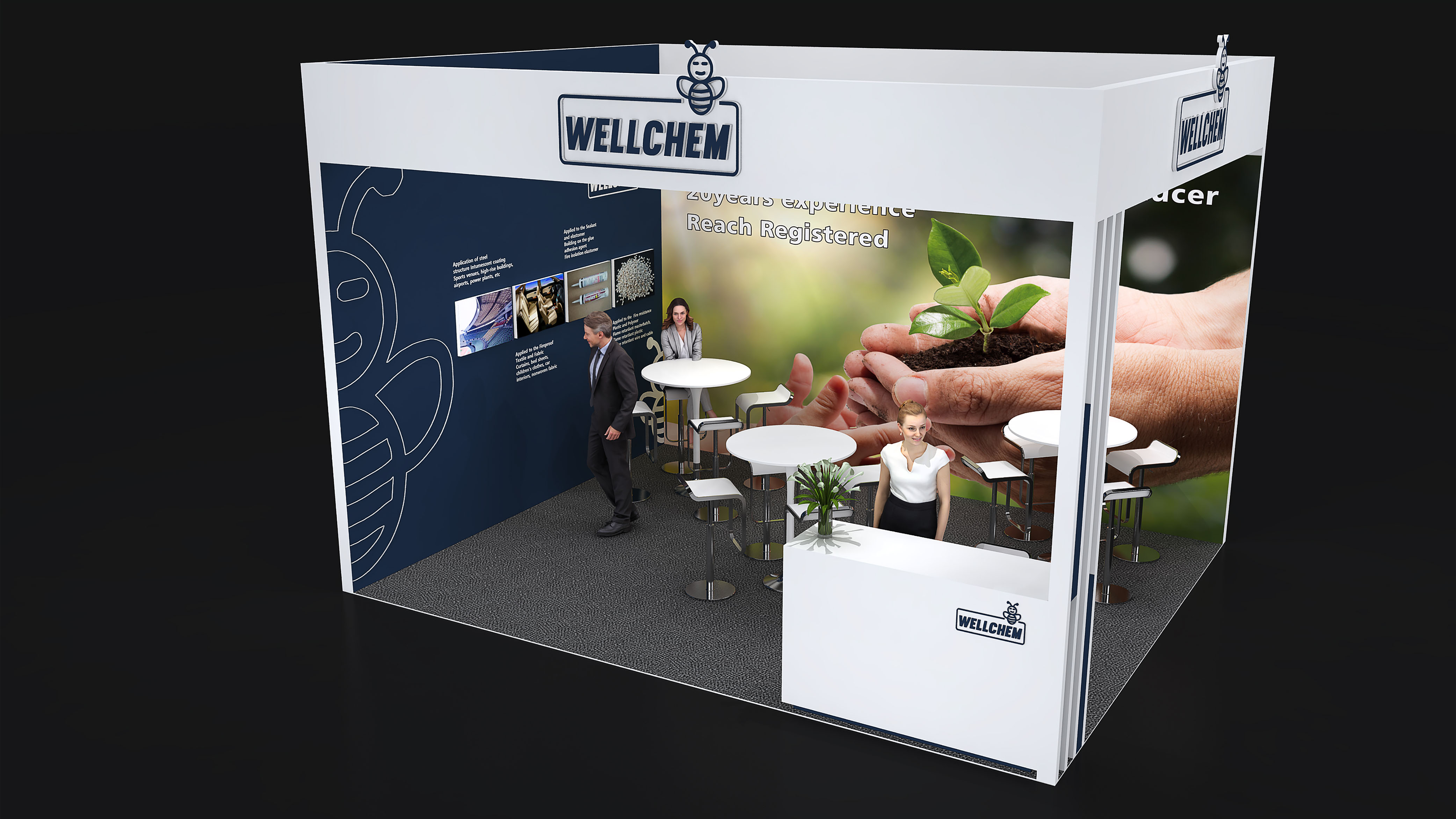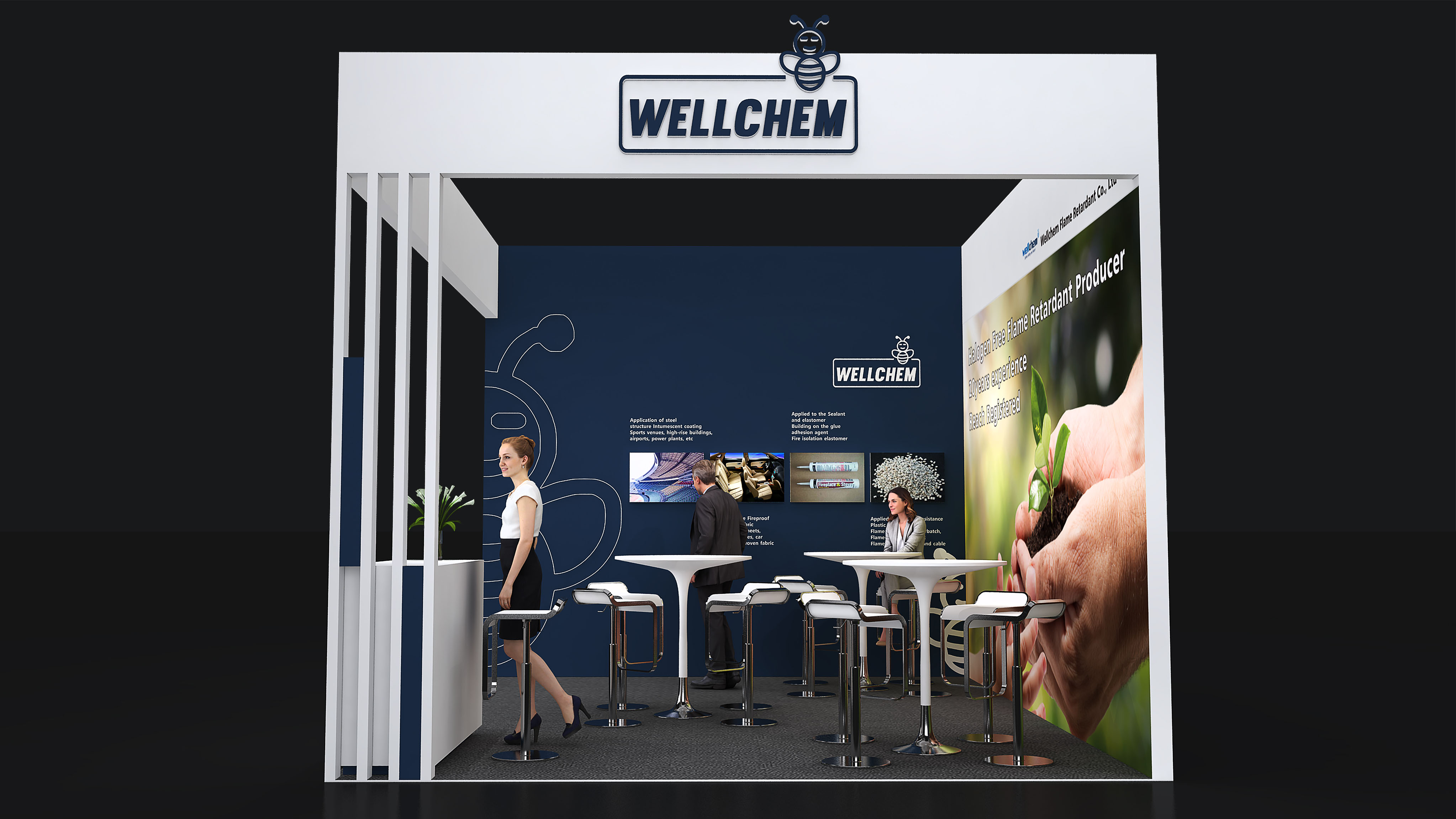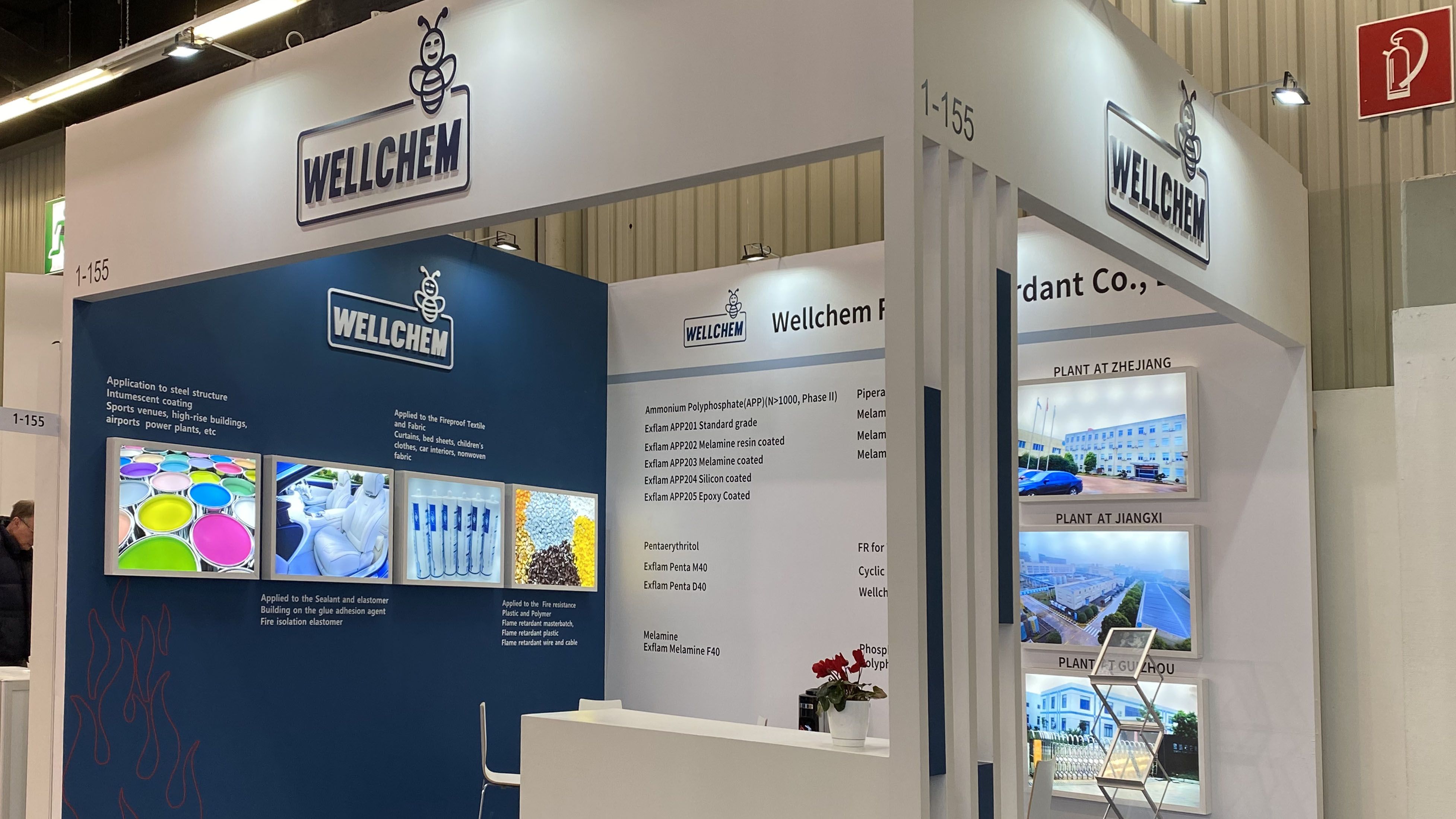 衢州衛(wèi)凱化工有限公司位于國(guó)家循環(huán)經(jīng)濟(jì)示范基地衢州綠色集聚園區(qū),園區(qū)內(nèi)有巨化集團(tuán)等著名化工企業(yè),為園區(qū)內(nèi)企業(yè)提供豐富的基礎(chǔ)化工原料和各類(lèi)化工專業(yè)人才。衢州衛(wèi)凱化工有限公司是繼德國(guó)Clariant和Budenheim之后世界第三“結(jié)晶II型高聚磷酸銨(n>1000)”的生產(chǎn)和服務(wù)商,在膨脹型防火涂料,塑料,紡織阻燃劑等領(lǐng)域具有重要的國(guó)際市場(chǎng)地位。公司獨(dú)立開(kāi)發(fā)和生產(chǎn)的(烷基)次磷酸鹽系列產(chǎn)品和三嗪類(lèi)成炭劑是目前最前沿的革新產(chǎn)品,為了緊隨德國(guó)Clariant和意大利Italmatch致力于推動(dòng)市場(chǎng)發(fā)展,衛(wèi)凱化工在展臺(tái)設(shè)計(jì)搭建方面也確實(shí)下足了功夫。