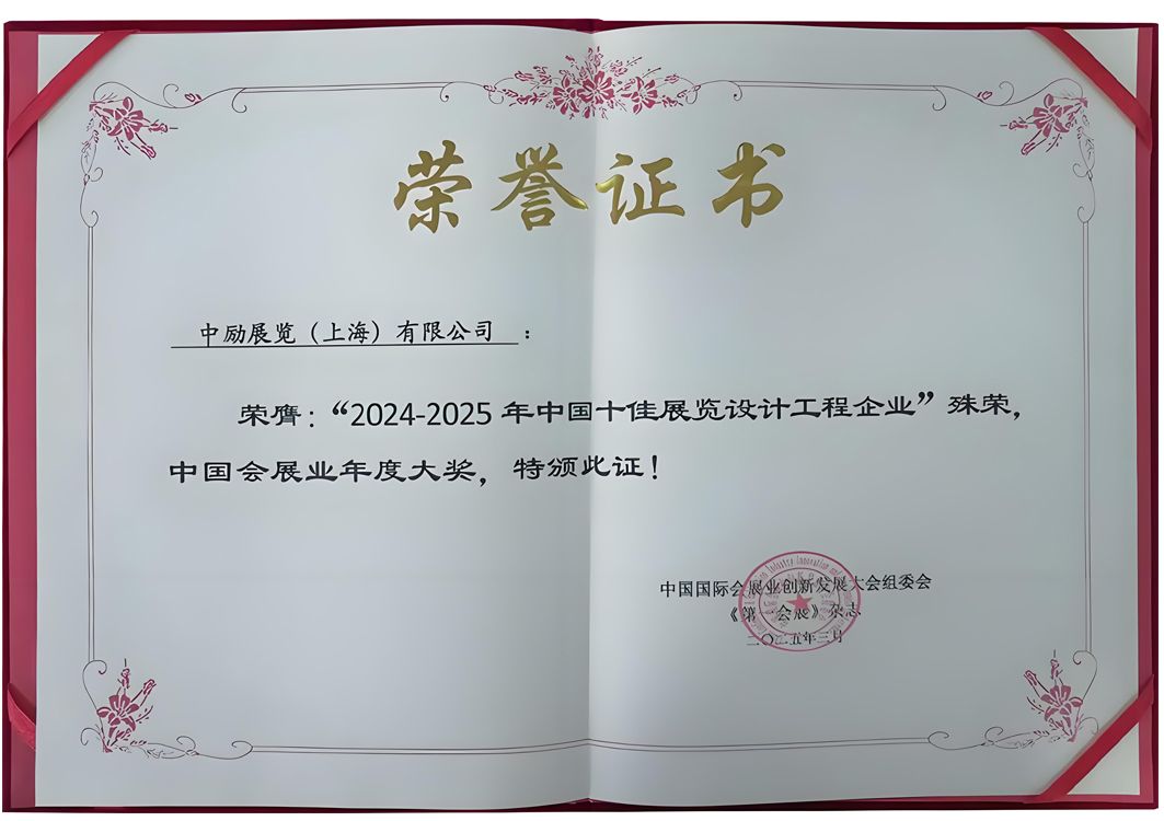 在剛剛落幕的2024-2025年中國國際會展業(yè)創(chuàng)新發(fā)展大會上,中勵展覽憑借卓越的設(shè)計實(shí)力與創(chuàng)新精神,榮獲“中國十佳展覽設(shè)計工程企業(yè)”稱號。這一殊榮不僅是對中勵展覽多年來努力的肯定,更是對公司在展覽設(shè)計領(lǐng)域持續(xù)創(chuàng)新的高度認(rèn)可。