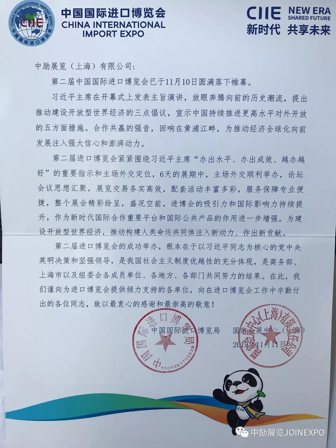 中勵展覽作為中國國際進口博覽會國家展和企業(yè)展中選推薦特裝工程服務(wù)商之一,收到了一封來自中國國際進口博覽會的官方感謝信,以感謝中勵展覽為進博會成功舉辦作出的貢獻,向在進口博覽會辛勤工作的全體同志們致以最崇高的敬意。一封感謝信,是對中勵展覽的認(rèn)可,也是中勵展覽以專業(yè)技能積極參與進博會建設(shè)的有力行動!