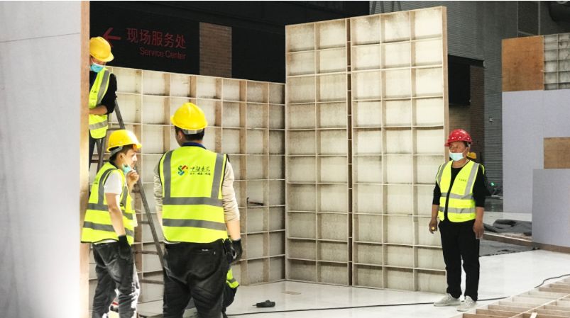 展臺(tái)搭建現(xiàn)場(chǎng)施工團(tuán)隊(duì)規(guī)范化安裝作業(yè)
