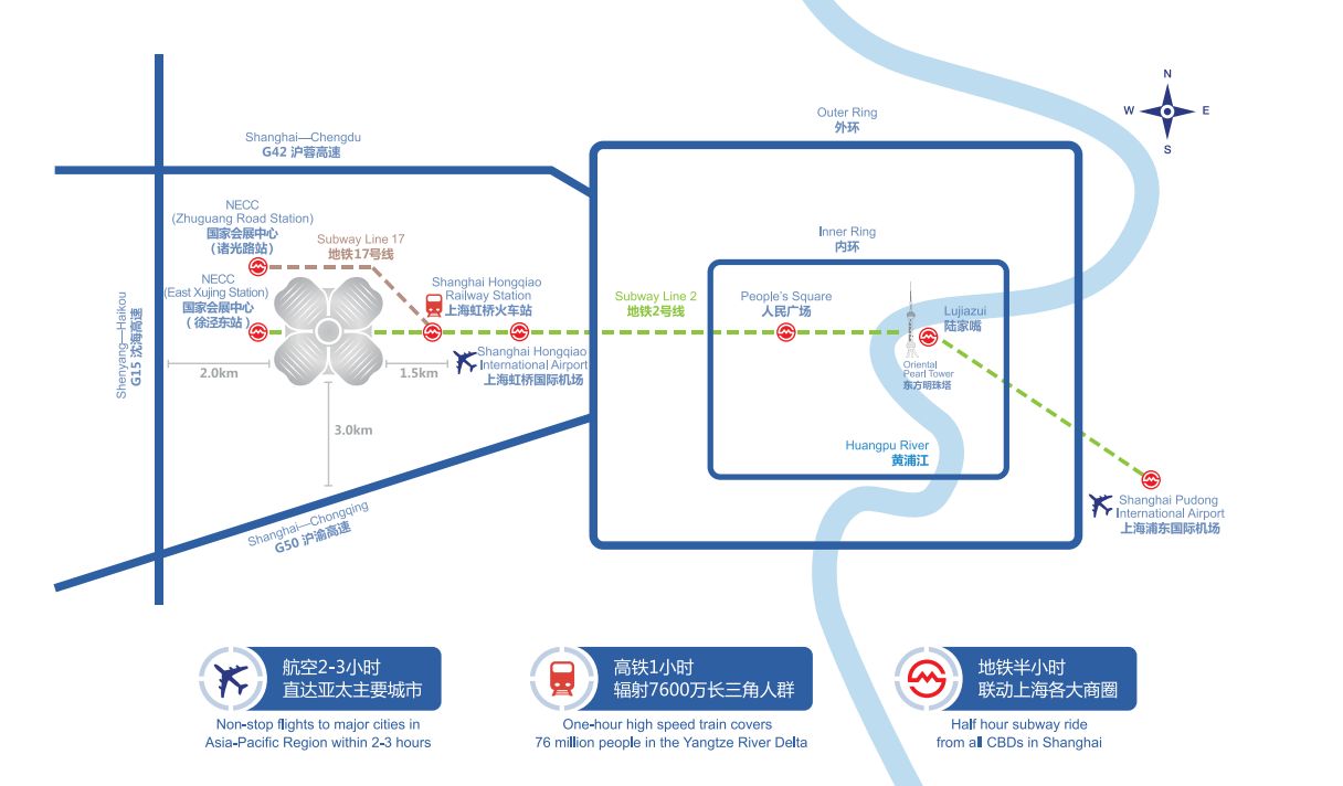 國家會展中心(上海)距離虹橋機場1號航站樓約4.5公里(直線距離),距虹橋機場2號航站樓約2公里(直線距離),距浦東國際機場約60公里,均可乘坐地鐵至國家會展中心(上海)。